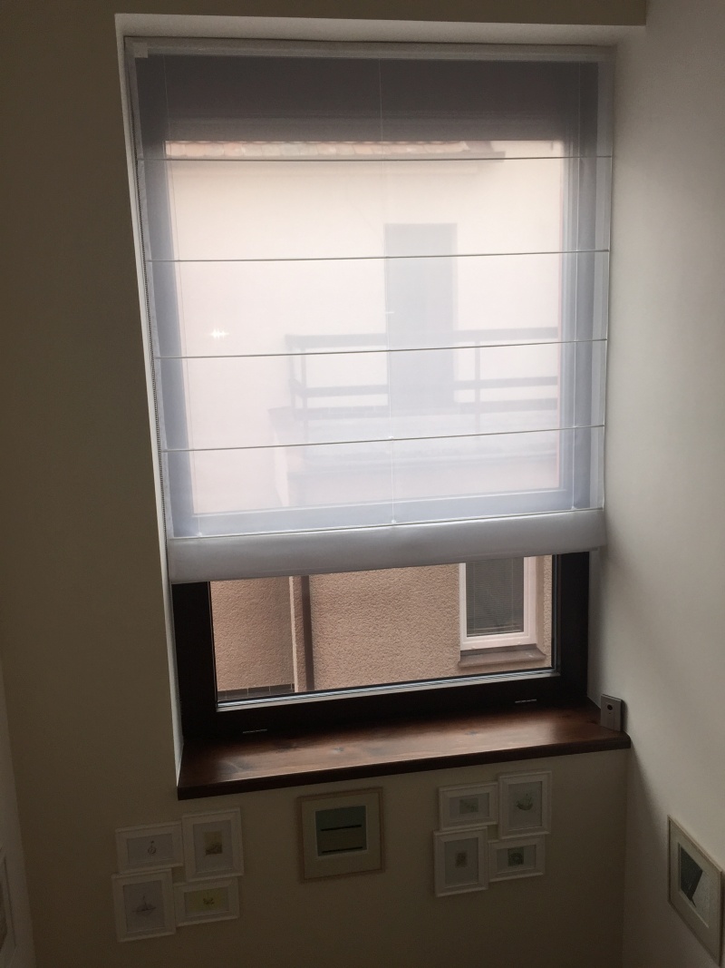 Záclony a průhledné lehké materiály stínící techniky dodaly požadovanou útulnost a příjemné rozptýlené světlo uvnitř domu. Realizace byla včetně technických prvků a doplňků.