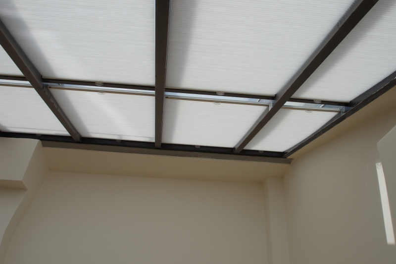 Systémy v těchto rozměrech udrží ocelová lanka pouze v krajích, tím jsou průhledy oken do nebe, při celkovém otevření stínění téměř nenarušeny.